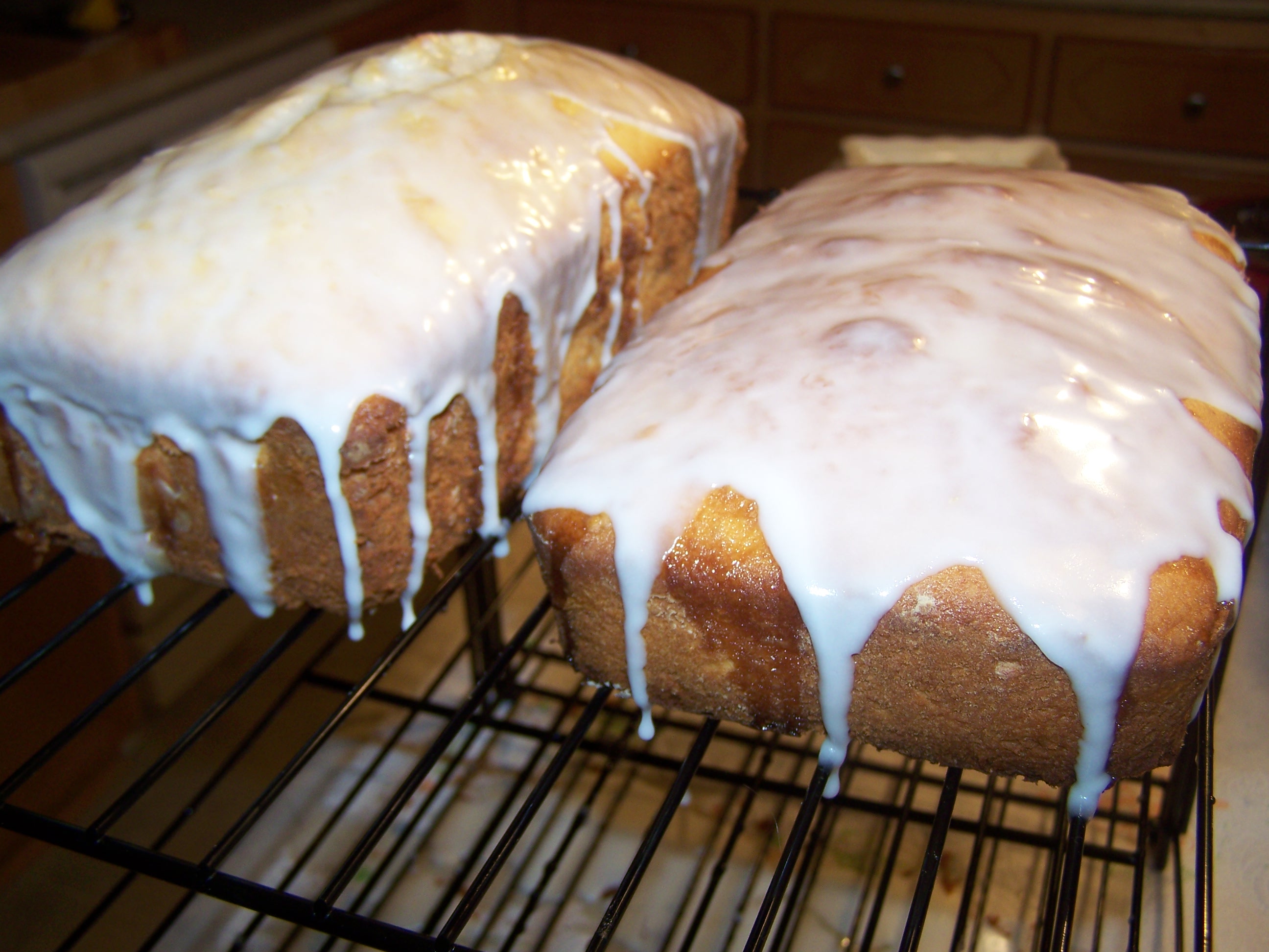 These cakes also include a lemon syrup between the glaze and the cake–if you look closely here you can see it. The syrup is a combination of sugar and fresh lemon juice dissolved and poured over the cakes when they are still warm. Once the cakes have cooled, you add your glaze and let it drip down the sides. YUM!