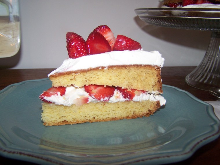 To make the filling for one cake, whip the cream, sugar, and vanilla in a mixer fitted with the whisk attachment until firm. Slice one of the cakes in half with a long, sharp knife. Place the bottom slice of the cake on a serving platter, spread with 1/2 the whipped cream and scatter with sliced strawberries. Cover with the top slice of the cake and spread with the remaining cream. Decorate with strawberries.
