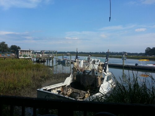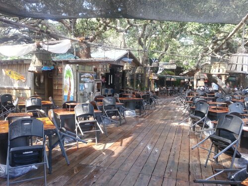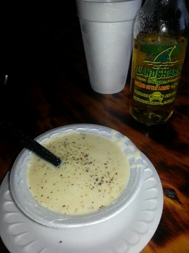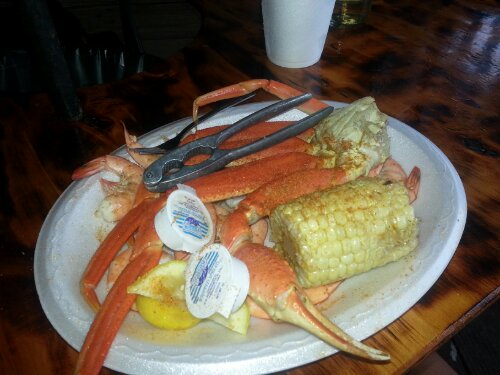 I ordered a Landshark Lager–only fitting being on the island–with a cup of Boston Clam Chowder and the Half and Half dinner: A half pound of snow crab legs with a half pound of wild Georgia shrimp for $19. 99. It came with corn on the cob. There are holes in the center of each table for discarding shrimp hulls and empty shells and I love being able to just toss your paper plate when you’re done. It’s casual dining on the coast, the way it should be.