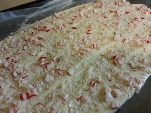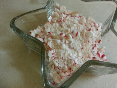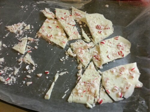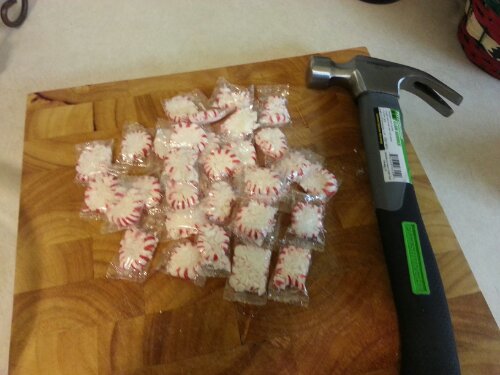 Meanwhile, bust up some peppermints with a hammer or a rolling-pin. Whatever you have around the house will work. This is great for stress relief too. Not a peppermint fan? Use chocolate chips, nuts, or dried fruit. You could even use heart-shaped sprinkles. However, the red and white in this candy works really well with the February 14 holiday and gives the chocolate a nice minty flavor (Kissy. Kissy. Wink, Wink.).