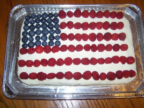 There are many variations of the All-American Flag Cake. I recommend starting with a boxed cake mix, the flavor of your choice. Bake the cake according to package directions in a 9 x13 dish. Then top it with light whipped cream and design the top with fresh berries. Keep it simple! You can make it as decadent or as light as you like.
