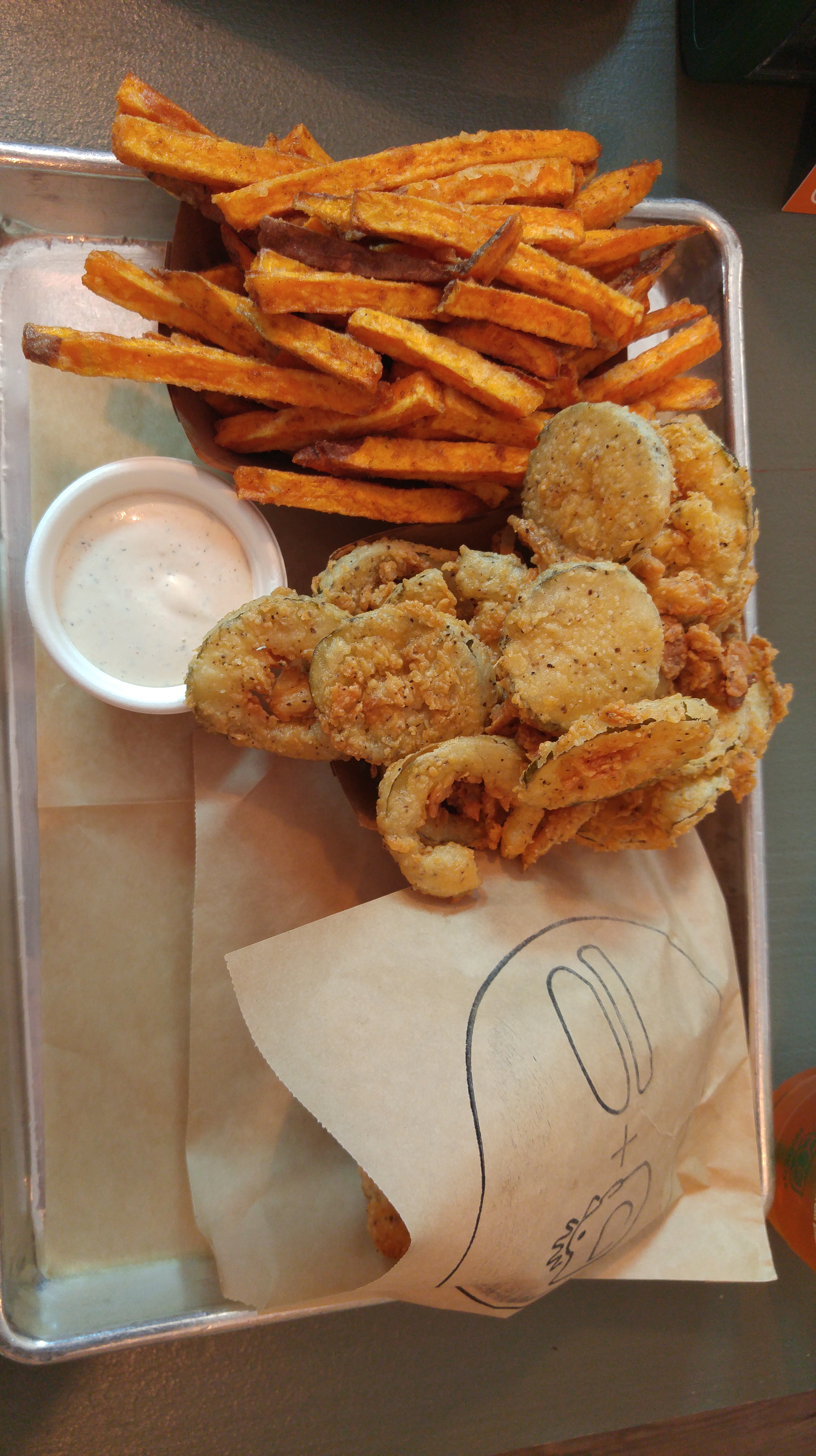 We started the meal with an order of fried pickles, served with house-made ranch dressing. With just one look, I could tell they were done right. Crispy with a thin coating of seasoned flour, the recipe starts with cucumbers sourced from Joseph Fields Farm in Charleston. Just $4 will get you an order. Check out Food Editor Hannah Raskin’s take on these pickles in The Post & Courier. The handcut fries (pictured below) are seasoned while they’re hot and have a nice crunch. Growing up at home, my dad would make them like this and let them drain on a paper grocery sack on the countertop.