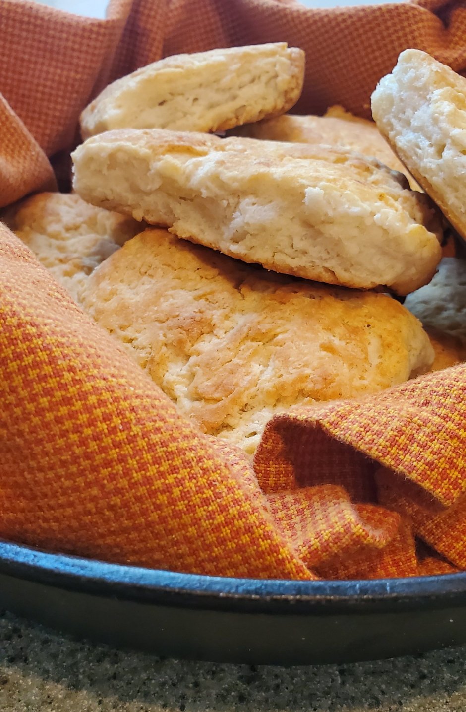 When I was growing up, there was never a supper without bread. I have wonderful memories of visiting my Grandma Dot, and seeing her come to the table with a basket of warm cat head biscuits. In the South, the term “cat head” describes biscuits so big, they resemble the size of a cat’s head. There’s nothing better when freshly baked biscuits are slathered with butter, local honey or homemade jam.