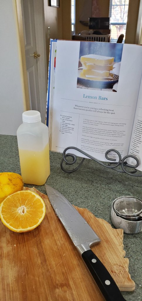 I was outside in my front yard the other day, when my neighbor approached carrying a tray of several bottles of freshly squeezed lemon juice. She has a big Meyer lemon tree, and just before the fruit expired, she had to come up with a way to use up all the lemons that hadn’t been picked. She gifted several neighbors with the juice, and I put it to good use right away! What a sweet gesture.