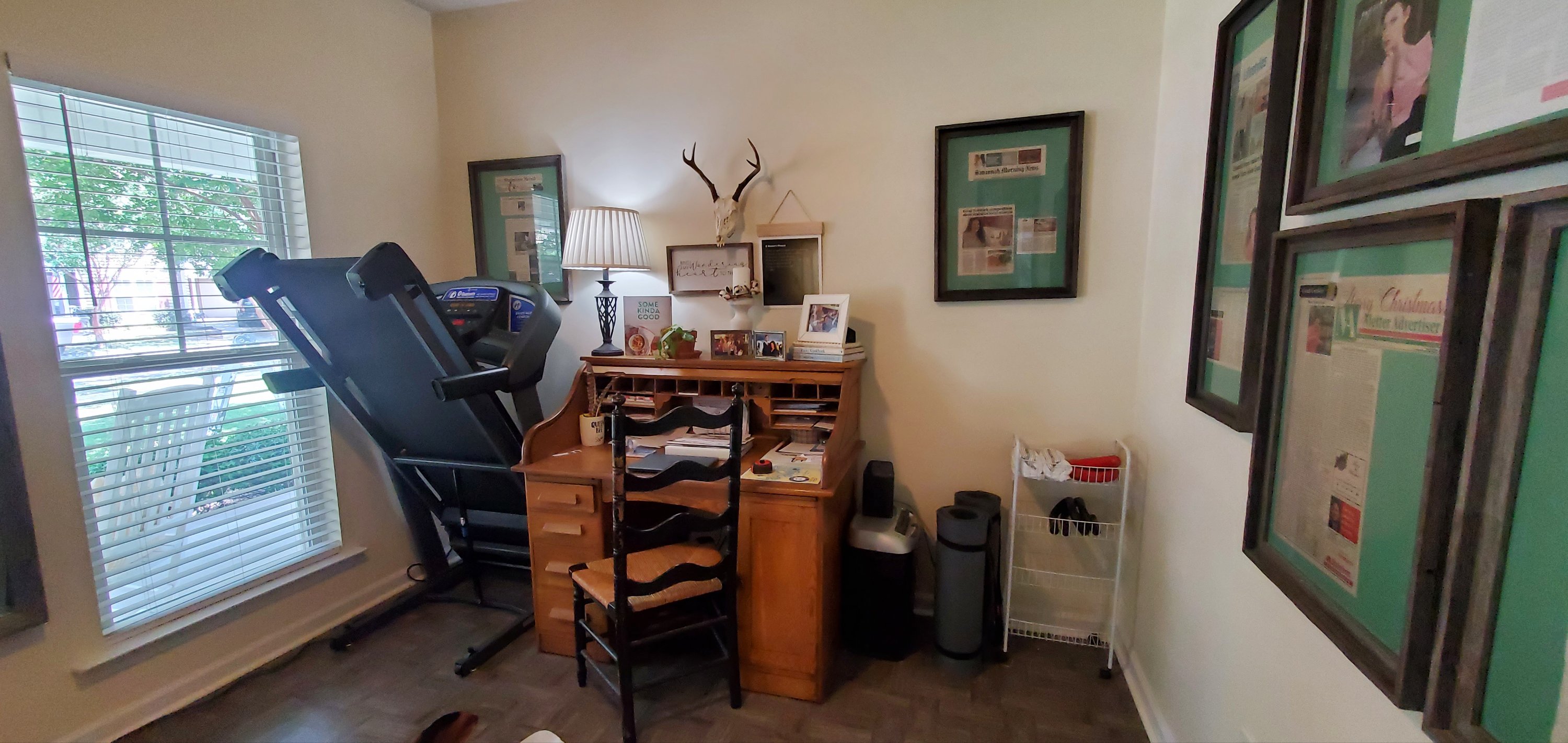 This room previously had carpet, and we changed the flooring to a more treadmill-friendly laminate last year. Playing off the gray, I also installed my “Dreams Don’t Work Unless You Do” art gallery as a COVID project during 2020. The gallery features newspaper and magazine clippings in farmhouse gray frames, matted to my signature seafoam green brand color. The media tells my story from my journey on ABC’s The Taste and Food Network Star, to self-publishing my first book, and inspires me to keep dreaming big and making it happen.