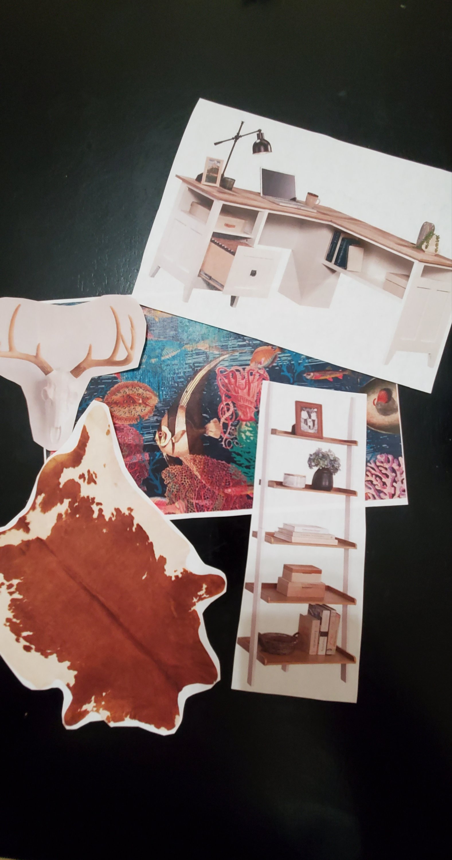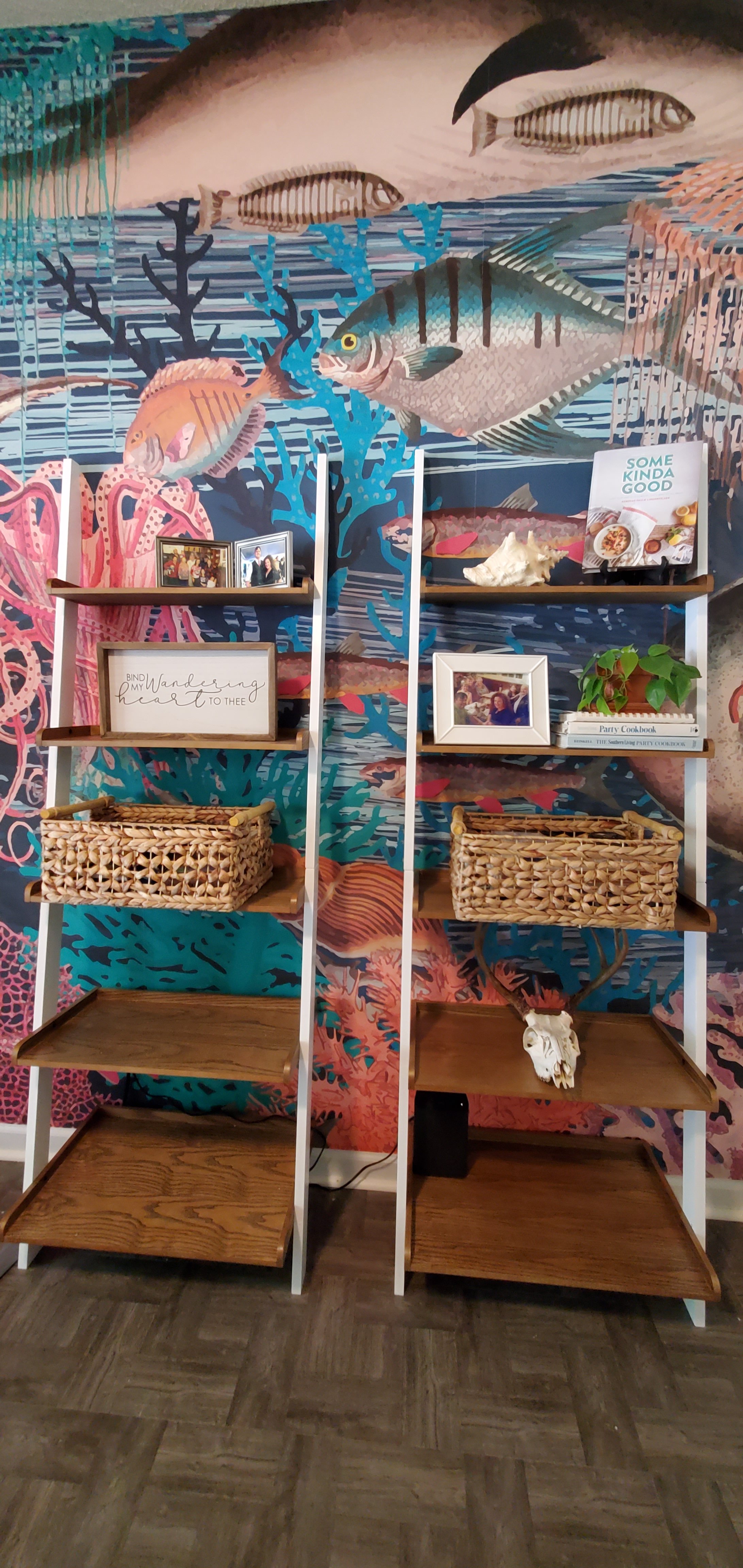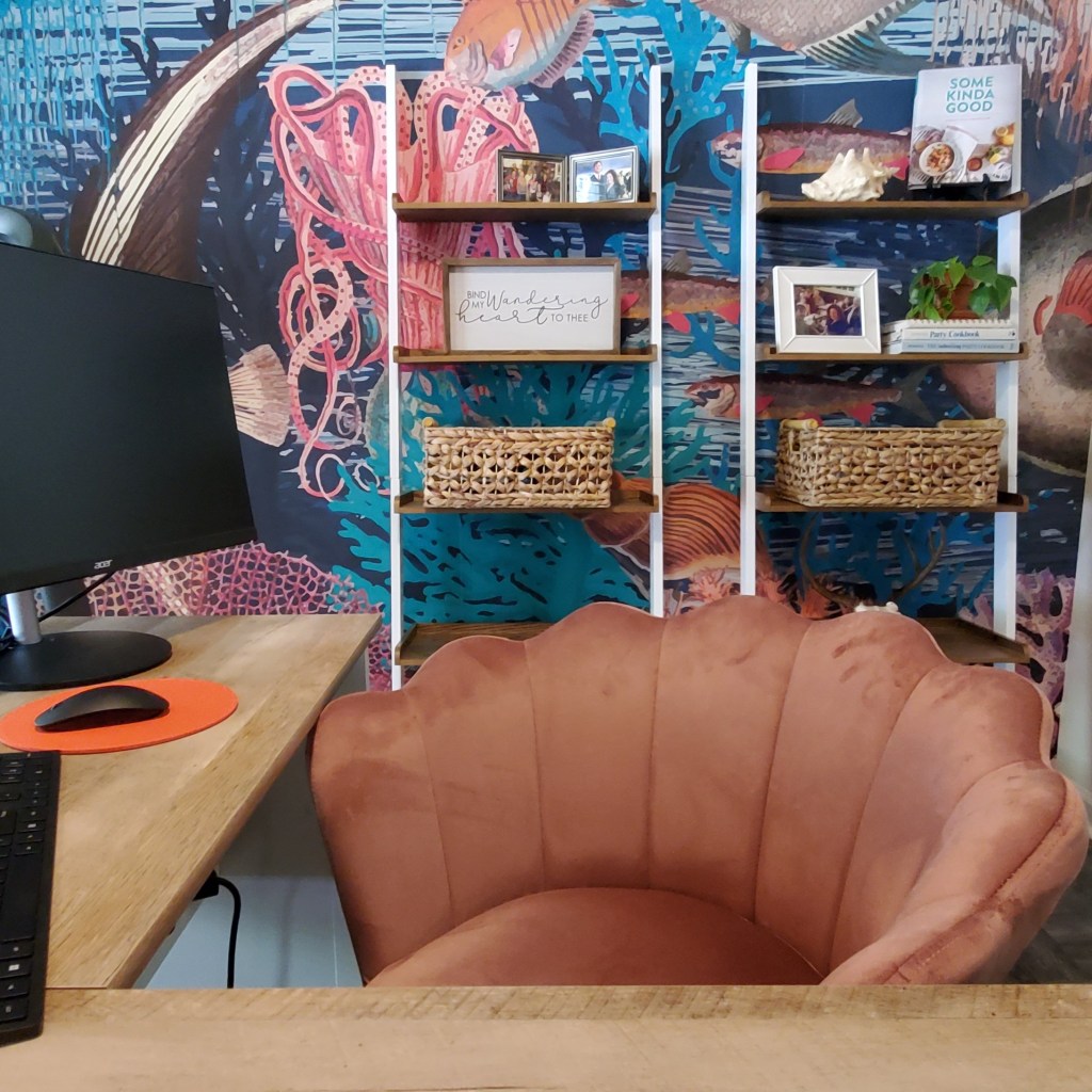 The room needed height variation, provided by two ladder style driftwood bookshelves positioned behind the L-shaped desk. The bookshelves are open in the back, so they don’t cover the wall mural. The desk features storage, cable management for hiding unsightly electrical wiring and room for writing, including a finished back for positioning anywhere in the room. The positioning of the desk was critical for me. The L-Shape allows me to face the natural light from the two windows. This is important for two reasons: It positions my face in the best light for video calls, and is not facing my computer screens, so the sunlight will not drown out what’s on the screens. The L-shape desk also has the primary side open to see others when they visit my office or walk through the French doors at the entrance of the room.