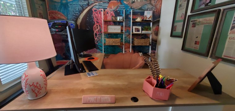 The seashell-shaped pink desk chair is such a fun detail to support the Coastal Farmgirl aesthetic. Think of ways you can surprise when reimaging a space! A new All-in-One computer has sleek lines, features proper storage, touch screen and a built-in camera. An additional monitor provides side-by-side screen comparison and space, a great benefit when working.