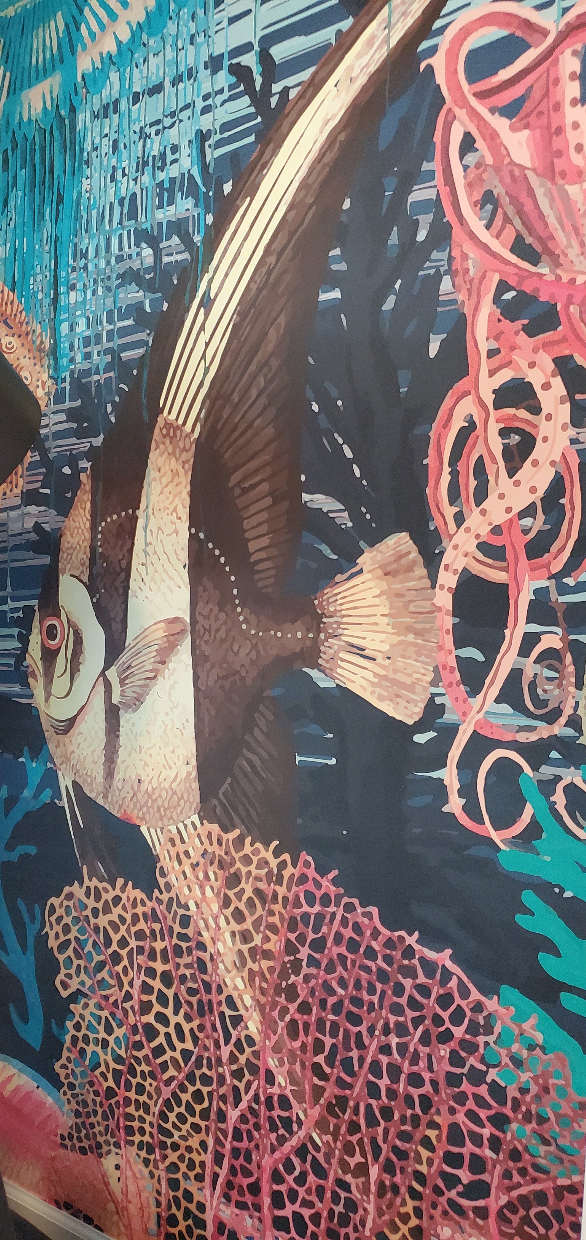 Using a few key elements I already had, such as the cowhide rug and a European mount of my husband’s first buck, I layered in new furniture and the pièce de résistance: An under the sea wallpaper mural I had imported from Turkey.