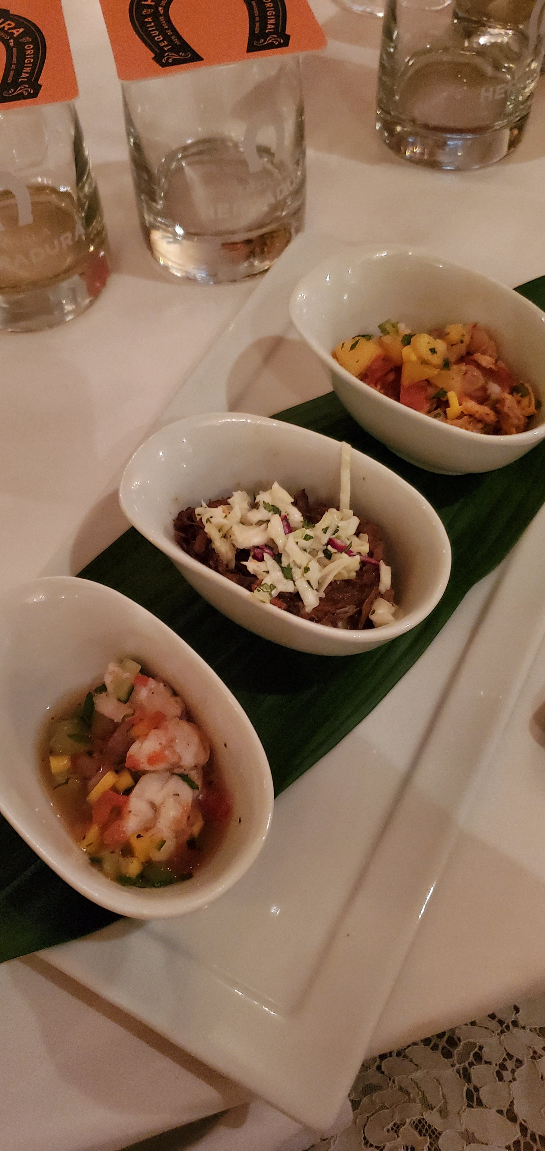 The first course tasting trio was divine – Shrimp Ceviche, paired with Silver; Pulled Pork with Cilantro Lime Slaw, paired with Double Barrell; and Chicken Tinga with Tropical Salsa, paired with Ultra. The Silver has a fiery spice with woody notes, while the Double Barrell has notes of cooked agave, vanilla, allspice, clove and oak. Last but not least, the Ultra was smooth and sweet with hints of cooked agave, caramel, and honey with toasted almonds.
