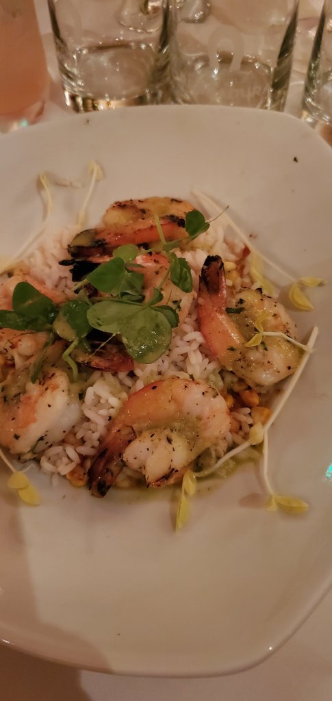 For dinner, I selected the Grilled Chili Lime Shrimp, served with rice and roasted corn. A Silver Paloma and a big wedge of grapefruit complemented it nicely. Pictured below is also the Braised Beef Short Rib served with spiced polenta and Roma tomato salsa.