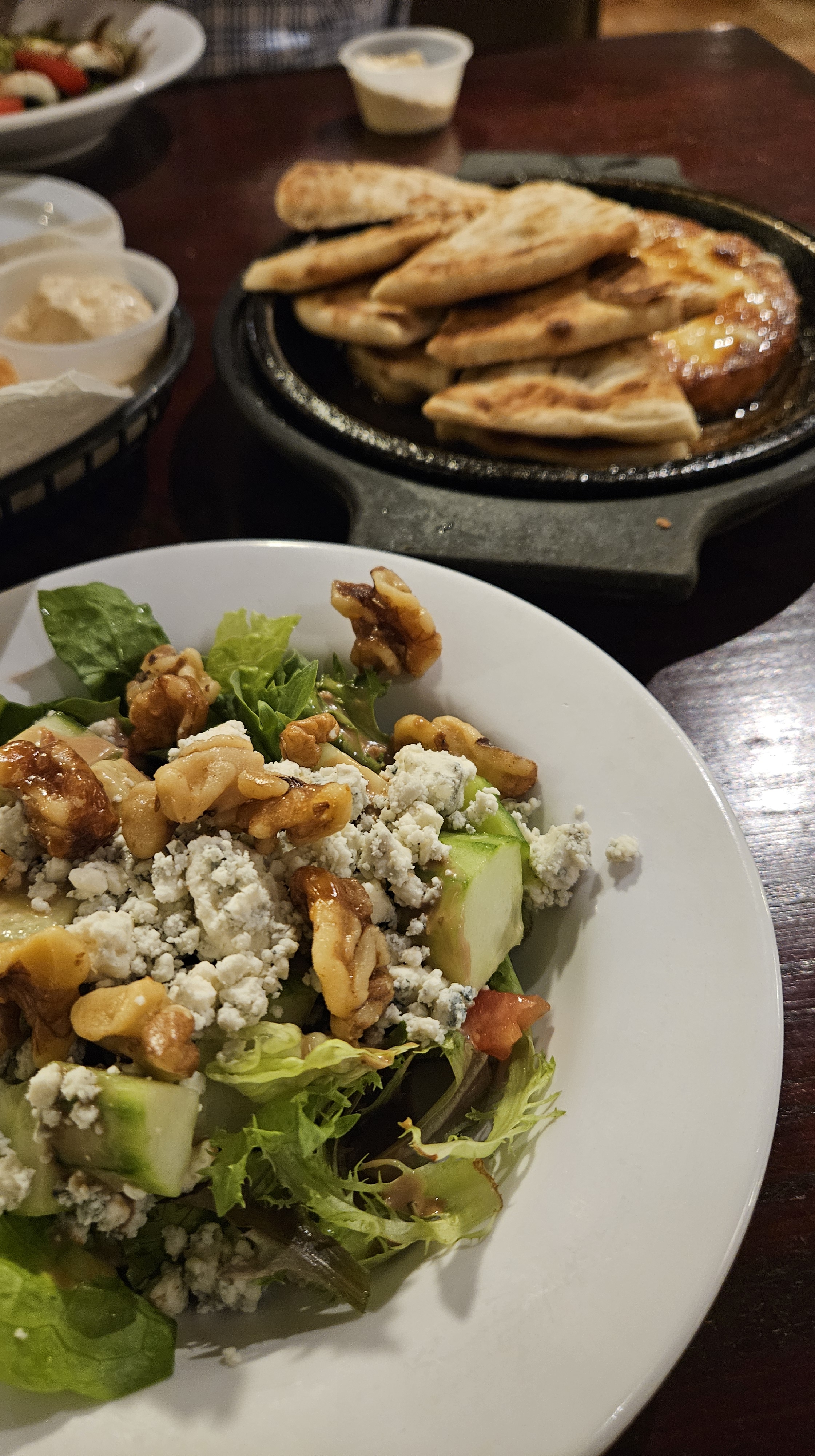 You must order the Sizzling Provolone – this is a non-negotiable. What’s not to love about piping hot cheese, served with warm pita triangles in cast iron? We look forward to this dish at every visit. I also recommend the Stuffed Grape Leaves, served with chilled lemon dressing.