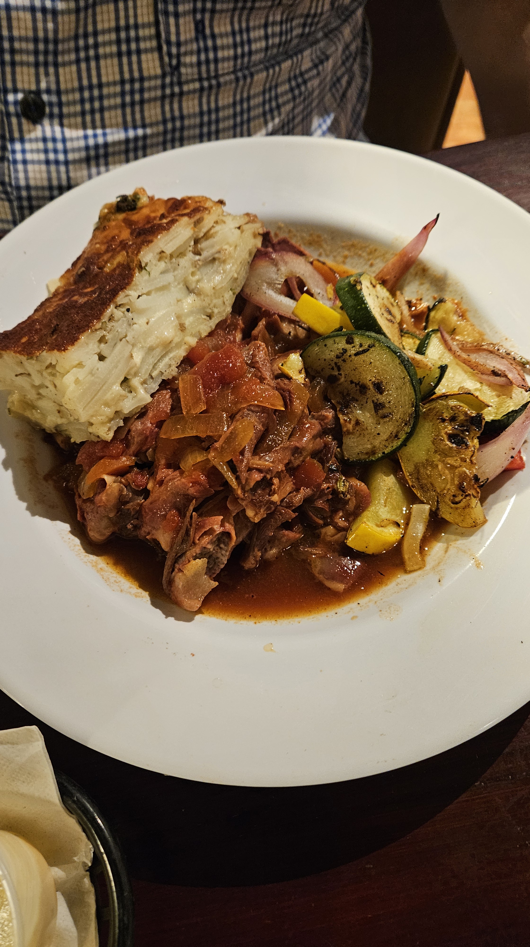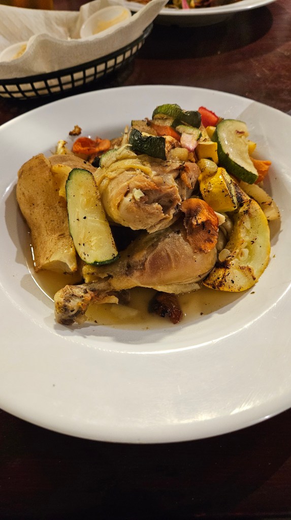 I never typically order chicken as my entree when dining out, because it is the protein I cook the most at home. However, on this evening, the idea of lemon potatoes sounded so good, I had to try it. Oven-roasted quarter leg, lemon potatoes, and fresh vegetables, such as squash, red onion and zucchini. It was Some Kinda Good, and I sopped up the lemon butter sauce with the soft bread leftover from the beginning of the meal.