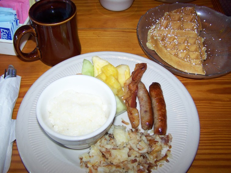 I got the breakfast buffet so I could pick and choose a few of my favorites–hash browns, fresh fruit, grits and sausage. The coffee mug was just the right size.