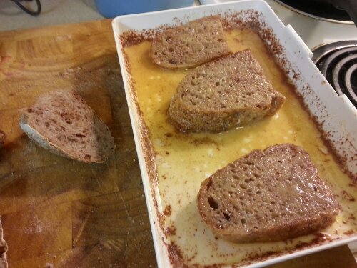 Order is important, especially in this step. Be sure to put your 9 x 13 x 2 in. baking dish into a larger roasting pan before layering the bread in the dish. Fill the roasting pan with warm water so that it comes about an inch up each side. This water bath will ensure the french toast stays moist during the long cooking process. Once the bread has toasted for 10 minutes, layer it in the casserole dish and pour the batter right down over the top. Let it soak for 10 additional minutes.
