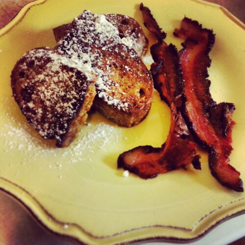 French toast is awesome for a few reasons: 1) It breaks up the monotony of pancakes and waffles, 2) Everything you need to make a batter for it is usually readily available on-hand or easy to get, and 3) It takes no time! For the batter, beat two eggs, whisk in a cup of milk or half & half, cinnamon sugar and a pinch of salt. Soak slices for about 30 seconds on each side.