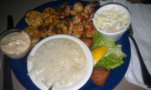 I ordered the shrimp and scallops dish, blackened, with grits. I don’t usually get scallops but I thought I’d give them a try. The shrimp was delicious, but I didn’t find the scallops to be that flavorful. Have you ever had scallops? I get the sense they must be like tofu in a way, taking on whatever flavor in which they’re cooked. The texture was spongy and just didn’t do much for me. Grits are the perfect accompaniment to shrimp any old time. The hushpuppies were crispy on the outside and succulent in the center, perfect for dipping in their house remoulade sauce (pictured left above).