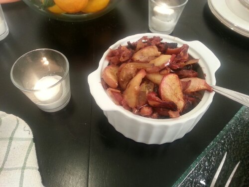 Nothing compliments pork like a side of delicious cinnamon apples sautรฉed in butter. This is as simple as it gets. Slice 5 to 6 medium apples about a 1/4 inch thick and saute in four tablespoons of unsalted butter. Allow them to cook down, then season with cinnamon and keep them warm. You don’t even have to peel them!