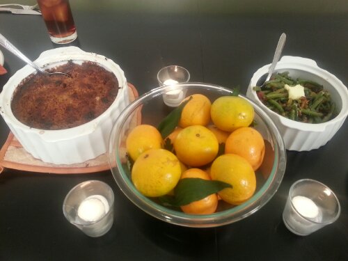 Green beans may be a popular side item, but served this way you can’t go wrong.ย My Farm-raised Green Beans also feature Hunter Cattle’s smoked bacon and sweet Vidalia onions and homegrown tomatoes from the Statesboro Mainstreet Farmers’ Market. Cook the bacon and set aside to drain on paper towels. Saute diced onion and tomato in the remaining bacon fat, season with salt & pepper and add to cooked green beans with a pat or two of butter. Top with crumbled bacon. On the left above, Mama’s Sweet Potato Casserole is a regular at every family function. It adds a wonderful pop of color to the plate. The topping, made of chopped pecans, brown sugar, flour and butterโis like candy.