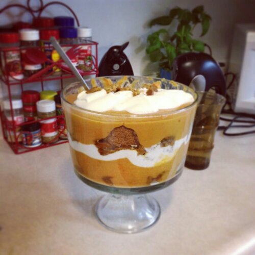 After a mouth-watering meal, a 14-layer cake or heavy pie is overwhelming. My Pumpkin Spice Trifle hits the spot. Complimented by soft spice cake and crunchy gingersnap cookies, it’s like a pillow-y cloud of light fresh whipped cream and vanilla pudding bursting with fall flavors. Plus, it makes a stunning presentation.