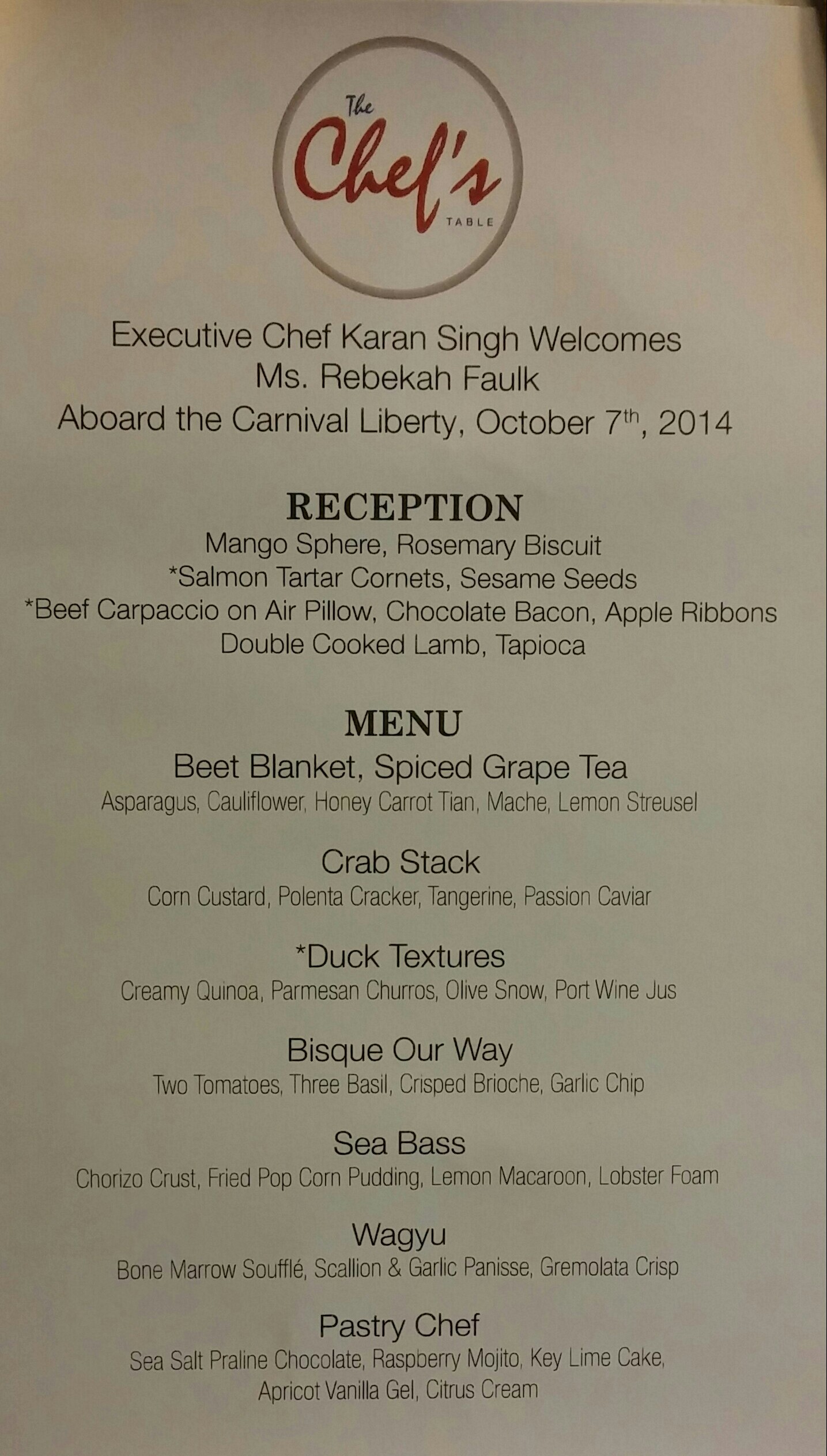 If you ever take a cruise with Carnival, I highly recommend spending your money on what will be one of the most exquisite and mind-blowing dining experiences you’ll ever have: “The Chef’s Table.” A private dinner with a seating of only 13, you’ll get a tour of the kitchen and one-on-one time with the Chef de Cuisine of the entire ship, along with unlimited wine. I regret to say that I didn’t have my camera on the Tuesday evening of our event, but I’m excited to share the menu we experienced and our group photo with you.