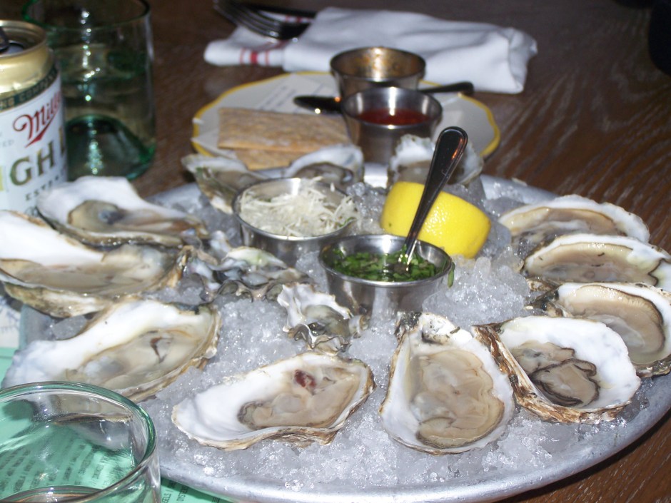 While we waited on our table in the main dining room, we sat at the Oyster Bar and tried just about everything–East and West coast oysters of every variety, snow crab & lobster knuckles, oyster crackers and salt & vinegar chips.ย The oysters wereย served with fresh horseradish andย a mignonetteย sauce (a sauce of vinegar and shallots, typically served with raw oysters). The mignonette sauce was so bright and fresh, it would awaken even a sloth.