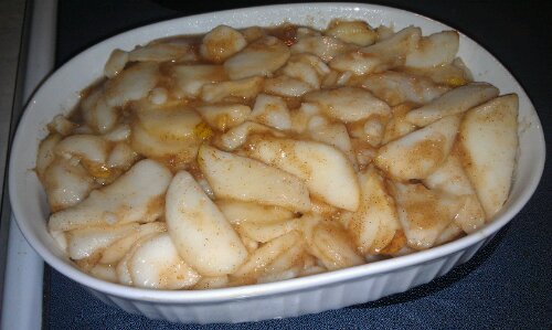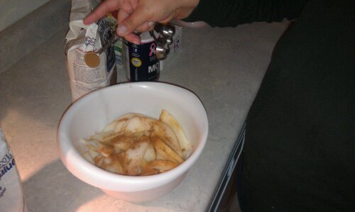 After the pears are peeled, cored and sliced, toss them with sugar andย cinnamon.