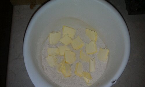 Combine your dry ingredients, then cut in cold butter.ย It’s important that your butter is cold so the mixture becomes nice and crumbly.