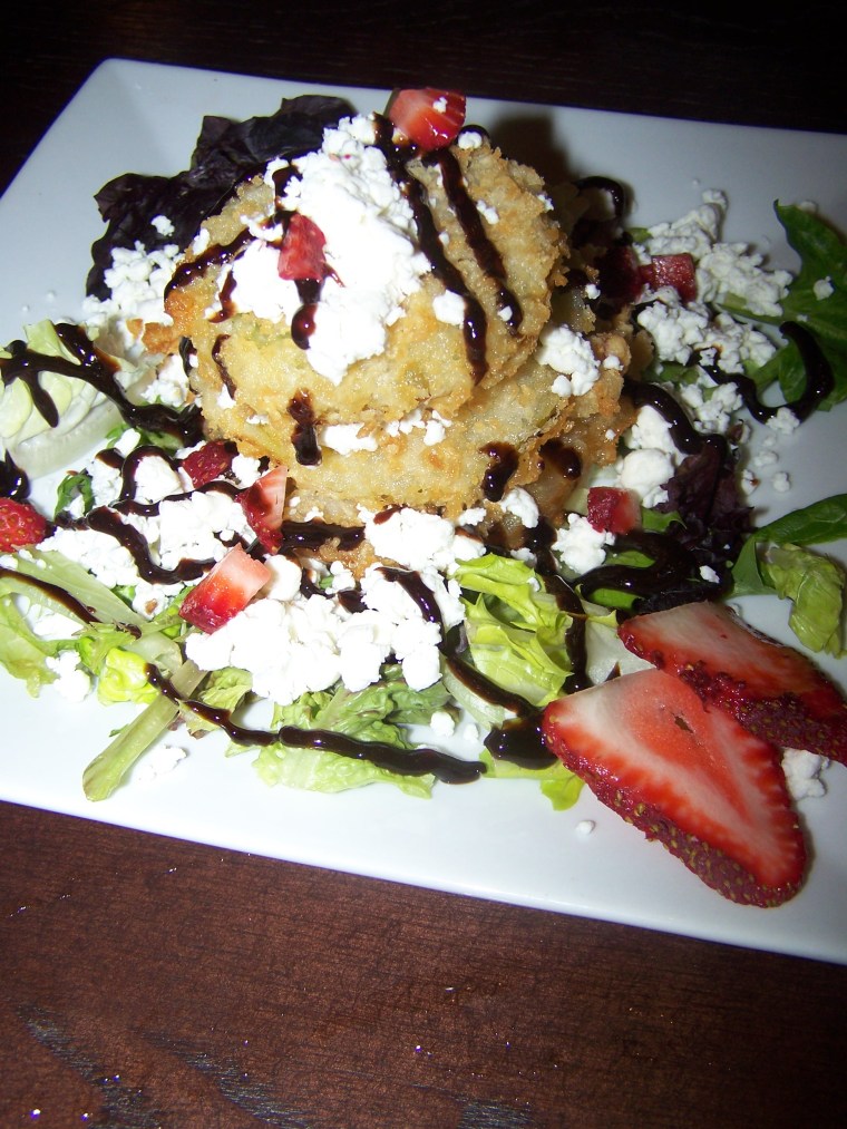 We began with a classicย southern menu item: Fried Green Tomatoes. They were lightly fried Georgia green tomatoes layered with goat cheese combined with balsamic-tossed arugula. Theย presentation was reminiscent of an ice cream sundae. Stacked high, garnished with strawberries and drizzled withย what reminded me of chocolate syrup, the tomatoes were crispy and the balsamic dressing provided aย sweet tartness with the creamy goat cheese.