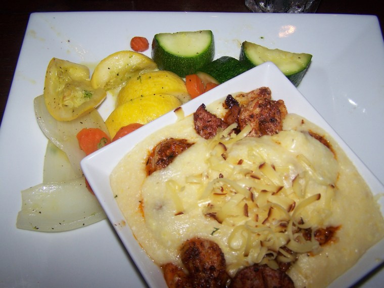 As I looked the menu over,ย I narrowed my decision downย between the Smoked Gouda Shrimp & Grits and the Wild Coastal Shrimp. I chose the shrimp & grits for $18.95 with the mixed veggie medley: zucchini, carrots, onions and yellow squash. The dinnerย entreesย come with 2 sides, so I also got a caesarย salad. The grits were cheesy and hot, seasoned just right. The sausage was spicy and plump and the shrimp had a Cajunย kick. Island Chop House and Seafood Grill offers the usual sides in addition to some pretty cool interpretations of basic carbs and vegetables with the volume turned up. Examples? Grilled Asparagus, Horseradish Roasted Garlic Mashed Potatoes, Sautรฉed Mushrooms or Blue Crab Mac-N-Cheese. Mom got the Blue Crab Mac-N-Cheese and man alive, it was Some Kinda Goody’all. It’s fried and spicy!