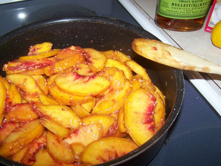 Once your peaches are peeled and sliced, transfer them to a large skillet and add in a good quality bourbon (I like Bulleit Rye American Whiskey), lemon juice, brown sugar, tapioca and cinnamon. You’ll let those flavors marry for about 10 minutes before cooking them.