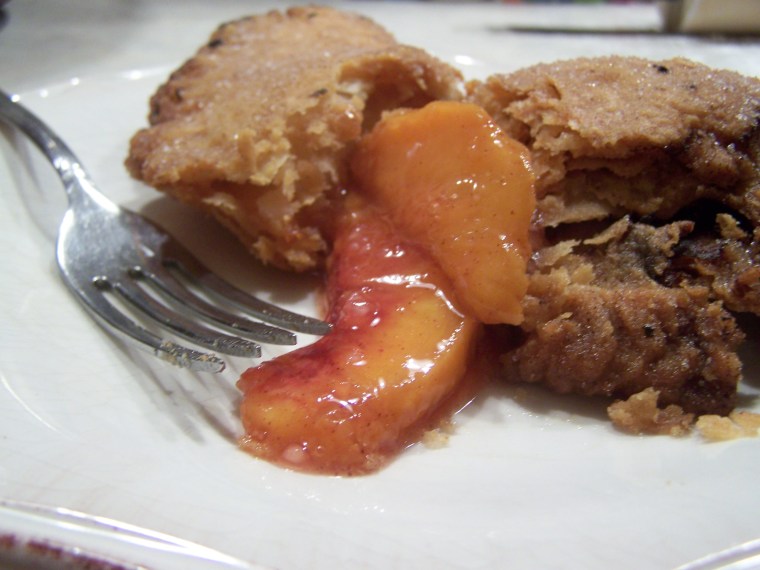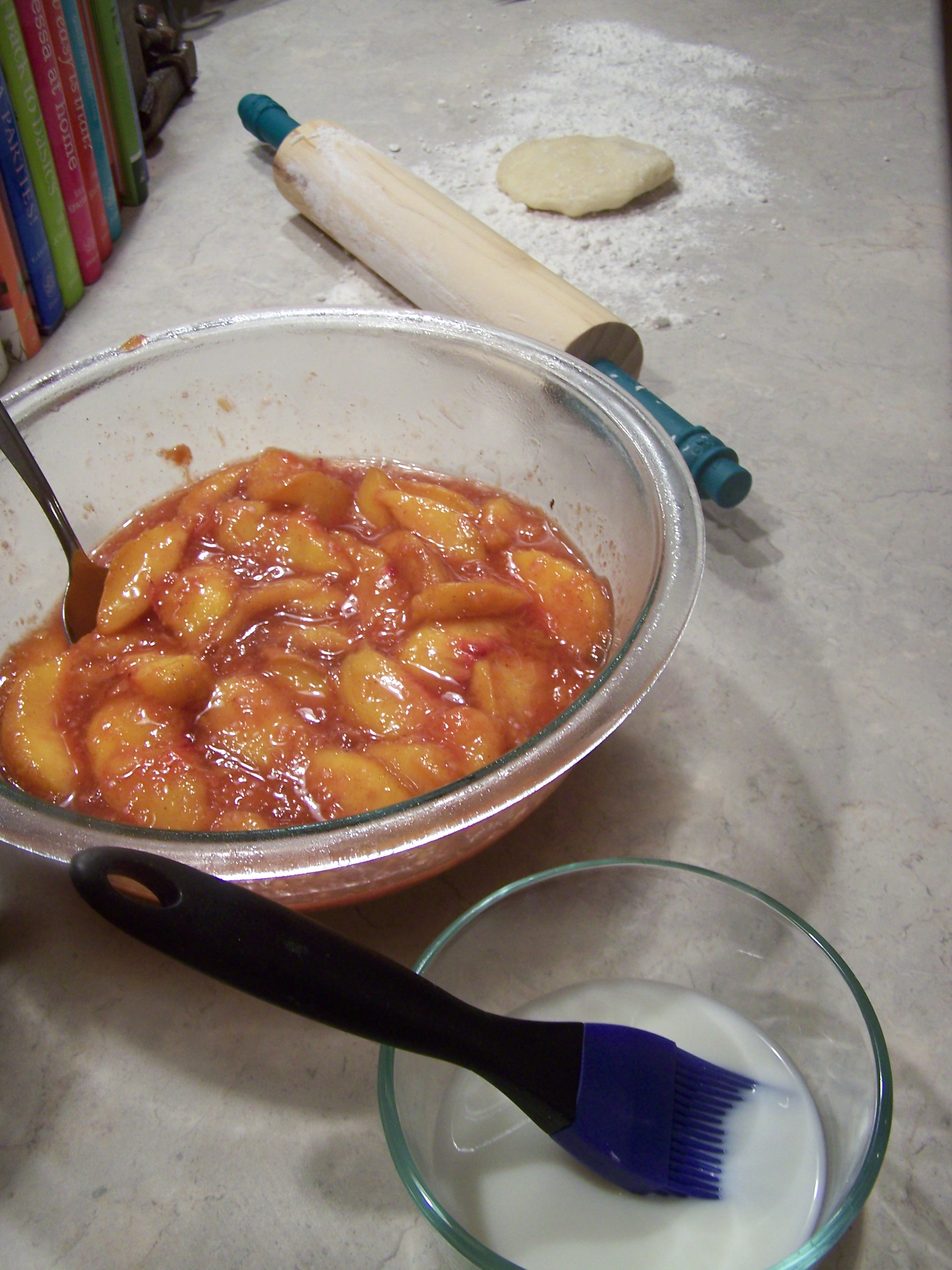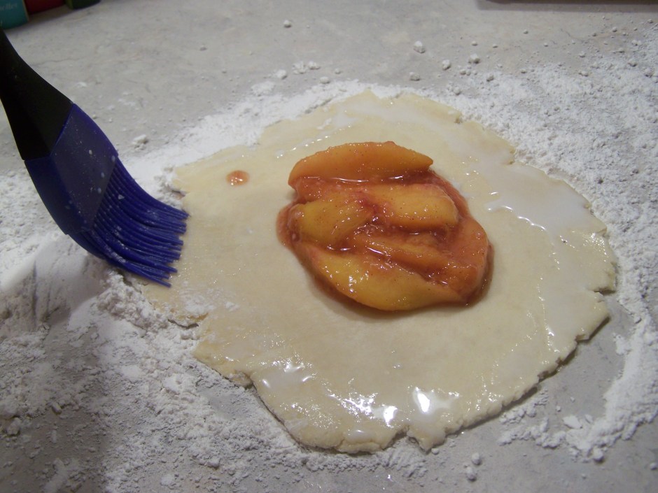 Roll out each disc of dough six inches wide. Fill the center with about a teaspoon of the peach mixture, but don’t overfill it. Then, paint the edges with milk, fold over and seal.